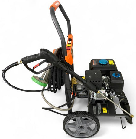 Der Hochdruckreiniger verfügt über eine Leerlaufdrehzahl von 3400 U/min und wird bequem über einen Reversierstarter in Betrieb genommen. Dank des großzügigen Kraftstofftanks mit 3,6 Litern und eines integrierten Seifentanks mit 1,8 Litern Fassungsvermögen sind auch längere Arbeitseinsätze ohne Unterbrechung möglich.