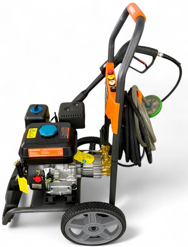 Der DAEWOO Hochdruckreiniger überzeugt mit starker Leistung und robuster Bauweise – ideal für anspruchsvolle Reinigungsarbeiten im privaten und gewerblichen Bereich. Ausgestattet mit einem leistungsstarken 4-Takt-Benzinmotor und einer Motorleistung von 7 PS, erzeugt das Gerät mit seinem hochwertigen Messingpumpenkopf einen beeindruckenden Arbeitsdruck von bis zu 207 bar bei einer Wasserfördermenge von 10 Litern pro Minute. Damit entfernen Sie mühelos hartnäckigen Schmutz von Fahrzeugen, Wegen, Fassaden oder Maschinen.