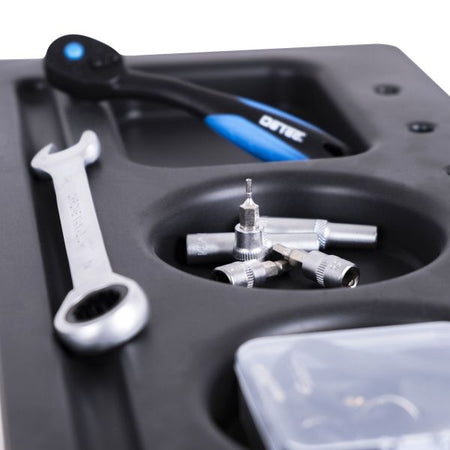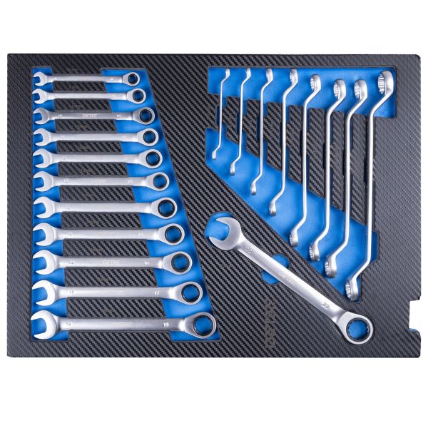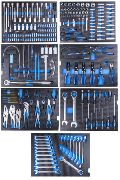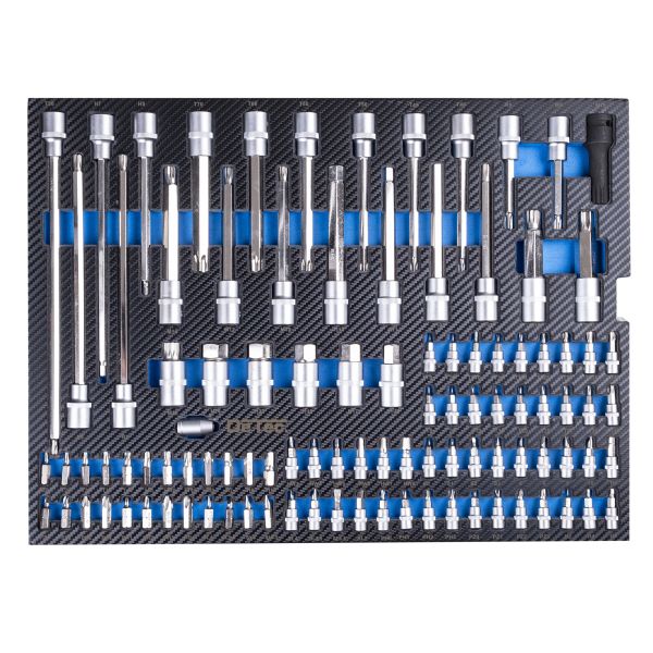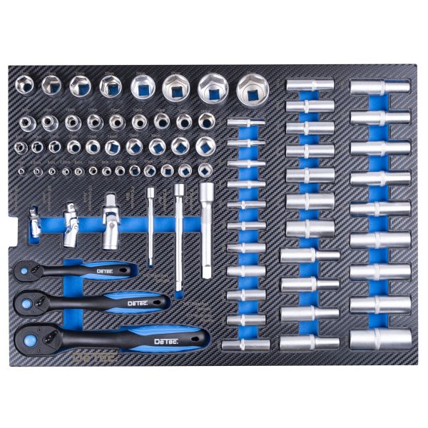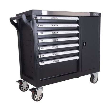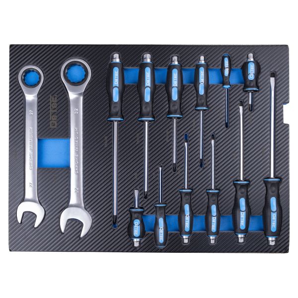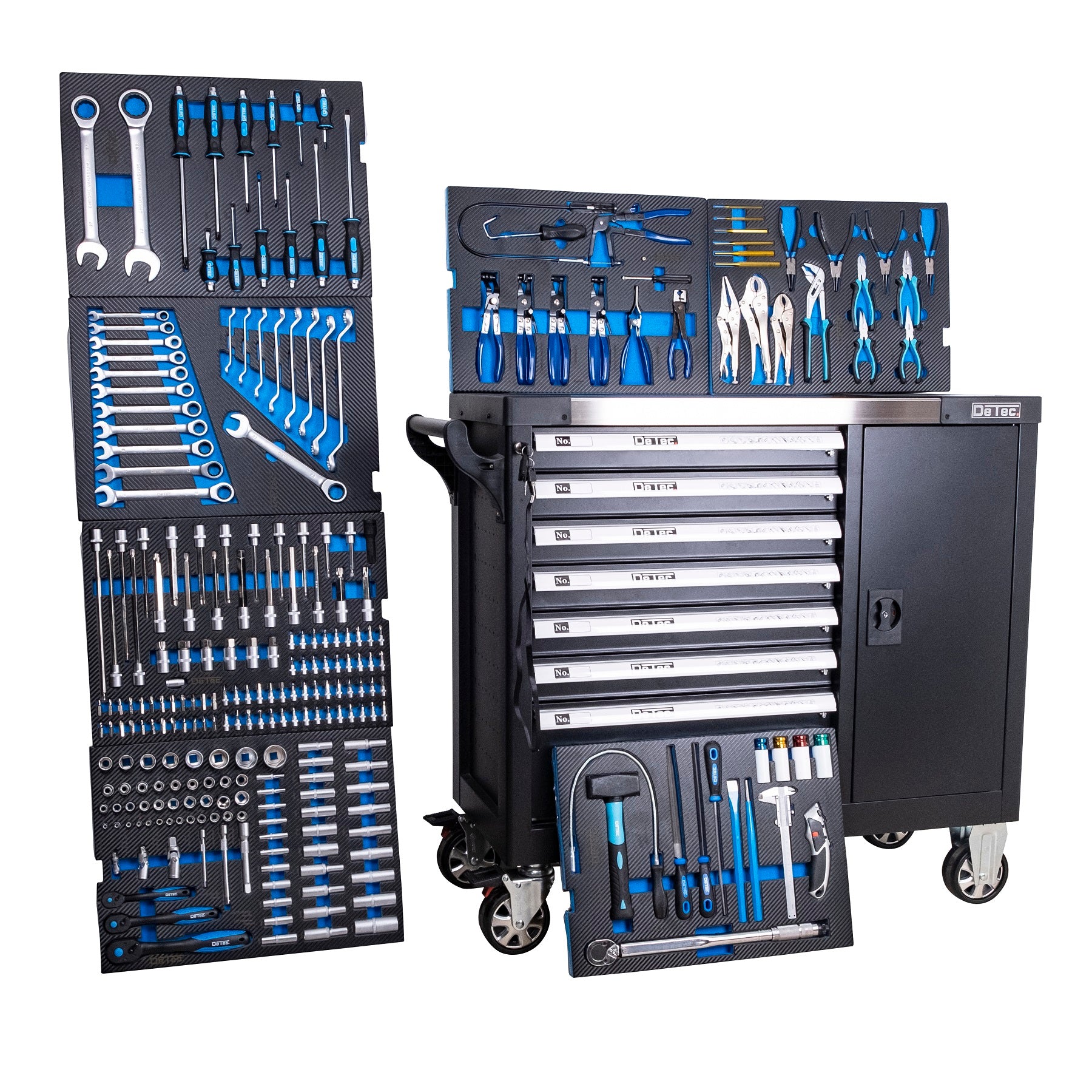 Dieser einmalig bestückte DeTec. Werkstattwagen besticht nicht nur durch 7 bestückte Schubladen mit kugelgelagertem Auszug, sondern auch mit einmaliger Bestückung. Die Einleger sind mit einer pflegeleichten Carbon-Oberfläche ausgestattet, die sich leicht abwischen lässt. Die besonders lange Edelstahl-Arbeitsfläche bietet viel Raum und unterschiedliche Ablagemöglichkeiten. Der Werkzeugwagen lässt sich dank der 4 Rollen und des seitlich angebrachten Griffs problemlos durch die Werkstatt manövrieren. Zwei der Rollen sind mit Feststellbremsen ausgestattet und verhindern so das Wegrollen auf unebenen Böden. Der Werkzeugschrank lässt sich komplett abschließen. Schubladen und Schrank lassen sich getrennt voneinander abschließen. Im Lieferumfang sind insgesamt 2 Schlüssel enthalten.Die genaue Bestückung können Sie gerne den Bildern entnehmen.