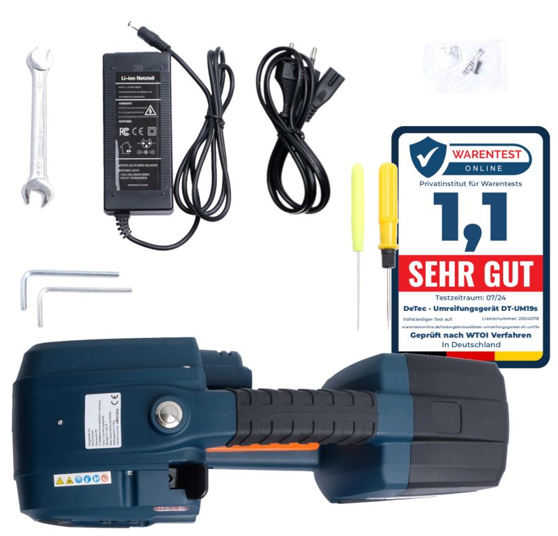 Ein Umreifungsgerät wird dann eingesetzt, wenn es darum geht, dass Produkte für eine Lagerung oder für einen Transport sicher und schnell verpackt werden müssen. Das Handumreifungsgerät DeTec. DT-UM19 eignet sich für eine vertikale und horizontale Umreifung von Ladungen, Paketen und Paletten verschiedener Größen. Es ist ein handliches Gerät, welches sich mobil einsetzen lässt und somit flexibel nutzbar ist.Unser Handumreifungsgerät DeTec. DT-UM19 arbeitet zuverlässig, schnell und sicher und sorgt dafür, dass ohne zusätzliche Verschlusshülsen eine Umreifung möglich ist. Das Umreifungsband mit einer Breite von 6 bis 16 Millimeter und einer Dicke von 0,5 bis 1,2 Millimeter wird dazu in das Gerät eingelegt und durch das Drücken von einem Spannknopf gespannt. Nachdem der Spannvorgang beendet ist, wird mit einer Arbeitstemperatur von 15 bis 20 Grad der Schweißvorgang eingeleitet. Das bedeutet, dass das Umreifungsband fest miteinander verschweißt wird, wobei eine Haftfestigkeit von etwa 75 Prozent erreicht wird, abhängig von der jeweiligen Bandqualität. Daten zum UmreifungsgerätMaße340 x 130 x 118 mmGewicht ohne Batterie2,90 kgGewicht mit Batterie3,20 kgZugstärke60-2800N, einstellbar (der maximale Wert hängt von der Qualität der Bänder ab)BandgrößeBreite 6-16 mm, Dicke 0,5-1.2 mmSpanngeschwindigkeit100-200 mm/sLufttemperatur5-45 °CHaftfestigkeitca. 75% des Umreifungsbandes (abhängig von der Bandqualität)Optimale Arbeitstemperatur15-20 °CIm Inneren vom Handumreifungsgerät befindet sich eine Spannrolle, die mit Zähnen versehen ist, die sich sozusagen in das Umreifungsband verbeißen. Dadurch wird das Band auf Spannung gehalten und wird im Anschluss durch den Friktionsverschluss oder auch Reib-Schweiß-Verschluss verschlossen. Durch diesen Vorgang entsteht eine Reibung, bei der eine Arbeitstemperatur von 15 bis 20 Grad erreicht wird. Diese Temperatur reicht aus, um das Umreifungsband (PE und PP) miteinander zu verschweißen und einen sicheren Transport zu gewährleisten.Sehr vorteilhaft beim DeTec. DT-UM19 ist die Tatsache, dass es sich problemlos mit einer Hand bedienen lässt. Ganz gleich, ob es sich dabei um den Spann- und Schweißvorgang handelt oder um die Freigabe der Spannrolle, ein Knopfdruck reicht bereits aus, um den Vorgang durchzuführen. Der Vollautomatik-Modus sorgt dabei für eine noch leichtere Handhabung, denn er speichert sowohl die Spannkraft als auch die Schweißzeit gleicher Packgüter. Dadurch müssen nicht alle Daten erneut eingestellt werden, so dass das Verpacken wesentlich effizienter und schneller geht.Das Handumreifungsgerät verfügt über einen leistungsstarken Lithium-Ionen-Akku, der keinen typischen Memory-Effekt mitbringt und eine ausgezeichnete Spannkraft ermöglicht. Während herkömmliche Geräte vollständig entladen müssen, bevor ein Neuladen durchgeführt wird, spielt das beim DeTec. DT-UM19 keine Rolle. Es lässt sich auch durchaus im halbvollen Zustand laden, ohne dass es dabei zu einem Leistungskraftverlust kommt. Sehr schön bei diesen kohlenbürstenarmen Motoren ist die Tatsache, dass sie überaus wartungsarm sind, so dass keine dauerhaften Unterbrechungen durch Wartungen und Co. auftreten.Daten zur Stromquelle und LadegerätStromquelle (Akku)TypLithium-Ionen-AkkuSpannung11,1 VoltLeistung4,0 AmpereAufladegerätEingangAC 100V-245V / 50-60 HzAusgangDC 12,6V/3,0ALadezeitLithium-Ionen-Akku 4,0 A/h, 12V DC mit einer Ladezeit von ca. 90 Minuten