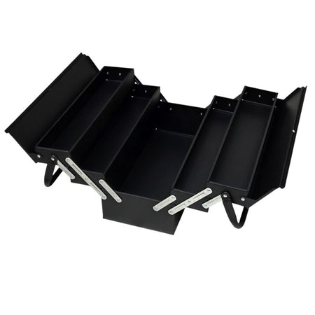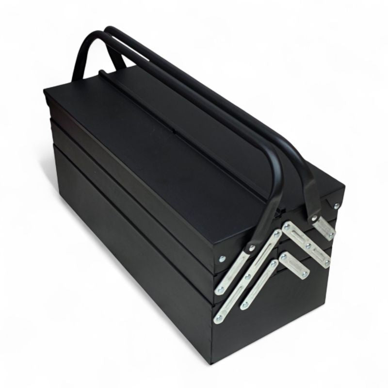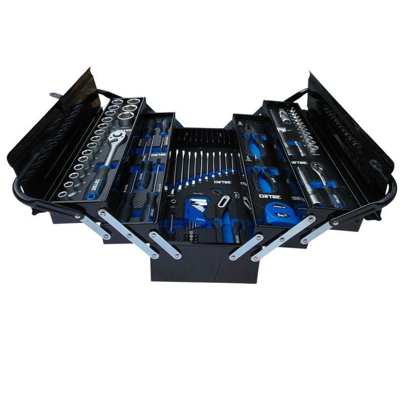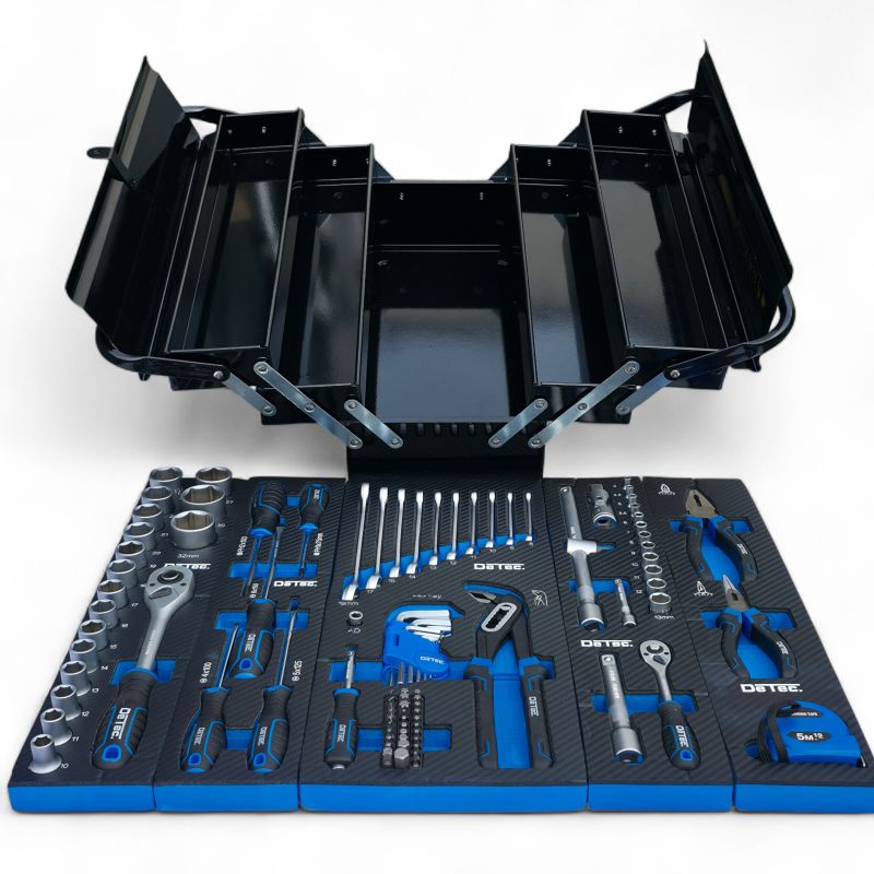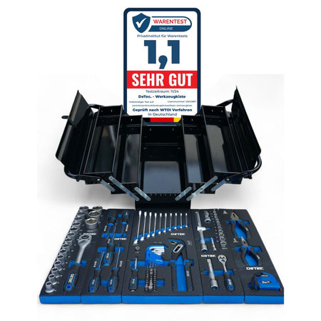Unsere klassische robuste Werkzeugkiste aus Metall mit 96tlg. Werkzeugsortiment ist sowohl für Heimwerker als auch für Profis der ideale Begleiter - egal ob zuhause oder im Beruf. Die aufklappbare Kiste ist mit Qualitätswerkzeug für den täglichen Einsatz bestückt. Selbstverständlich lässt sich die Kiste mit einem handelsüblichem Vorhängeschloss (nicht im Lieferumfang enthalten) abschließen.Daten und Fakten:Abmessungen: Länge 46,5cm x Höhe 21cm x Breite 21cmGewicht: 11,5 KgDie Bestückung finden Sie in der hier aufgeführten Liste:Ratschen 1/2" Zoll und 1/4" Zoll:Feinverzahnte Knarre 1/4" ZollFeinverzahnte Knarre 1/2" Zoll12 Nüsse für 1/4" Zoll 4-4,5-5-5,5-6-7-8-9-10-11-12-13-mm17 Nüsse für 1/2" Zoll 10-11-12-13-14-15-16-17-19-20-21-22-23-24-27-30-32mmVerlängerung 1/4" Zoll - 50 mmVerlängerung 1/4 Zoll x 2"Kardangelenk 1/2" ZollT-Gleitgriff 1/2" ZollDrehgriffSchraubendreher Satz:PH1x75mm PH2x100mm PH3x150mmSL5x75mm 6x100mmMaul-Ringschlüssel Satz: 6mm , 8mm , 9mm , 10mm , 11mm , 12mm , 13mm , 15mm , 17mm , 19mmZangen-Set:KombizangeSpitzzange, geradeRohrzangeInbus Satz im Klappset: 1,5mm , 2mm , 2,5mm , 3mm , 4mm , 5mm , 6mm , 8mm , 10mmZubehör:Maßband 5m2x Bit Set (T8, T9, T10, T15, T20, T25, T30, HW3, HW4, HW5, TT8, TT9, TT10, TT15, TT20, TT25, TT30, SL 4, SL 5.5, SL 7)