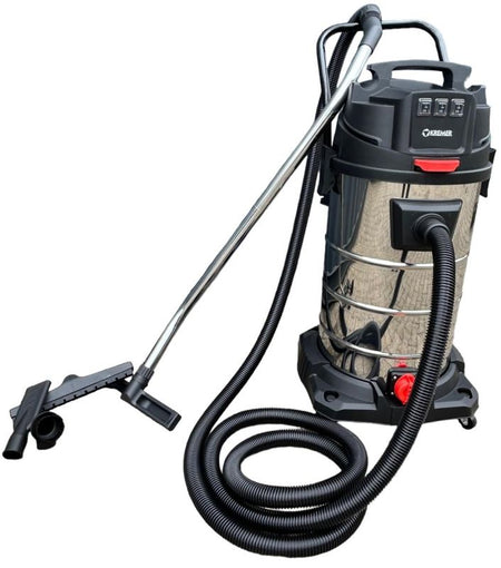 Industriesauger 3000 Watt Nass- / Trockensauger 100 Liter Schmutzbehälter Industriestaubsauger Nass- / Trockensauger Industriesauger 100 Liter Industriestaubsauger 3000W StaubsaugerErleben Sie die Vielseitigkeit und Leistung des Nass- / Trockensaugers! Die perfekte Lösung für anspruchsvolle Reinigungsaufgaben in Gewerbe, Industrie und im Privatbereich. Mit einer beeindruckenden Kapazität von 100 Litern und einem flexiblen 3-Motoren-System mit jeweils 1000 Watt, ist dieser Industriesauger ideal für jede Art von hartnäckigem Schmutz.Hauptmerkmale:Flexibles 3-Motoren-System: Ausgestattet mit drei leistungsstarken 1000-Watt-Motoren können Sie die Leistung des Staubsaugers individuell anpassen. Wählen Sie zwischen 1000 Watt, 2000 Watt oder 3000 Watt, je nach Bedarf und Anforderung.Leistungsstarker Motor: Im Maximalbetrieb bietet der Staubsauger eine Gesamtleistung von 3000 Watt, die selbst härteste Verschmutzungen entfernt und für eine gründliche Reinigung sorgt.Großzügiges Fassungsvermögen: Der 100-Liter-Edelstahltank ermöglicht es, große Mengen an Schmutz oder Flüssigkeiten aufzunehmen, sodass Sie weniger Zeit mit Entleerungen verbringen und sich voll auf die Reinigung konzentrieren können.Vielseitigkeit: Die Nass- und Trockenfunktion macht den Staubsauger ideal für unterschiedliche Einsatzbereiche – ob im Haushalt, in der Werkstatt oder auf Baustellen. 4 solide Lenkrollen machen den Industriereiniger mobil und ermöglichen Ihnen einen komfortablen OrtswechselRobuste Bauweise: Der Edelstahltank ist langlebig und widerstandsfähig gegenüber Korrosion und Beschädigungen, was den Staubsauger besonders robust und langlebig macht.Lange Reichweite: Ein 4,5 Meter langes Kabel und ein 5 Meter langer Schlauch bieten Ihnen die Flexibilität, große Flächen ohne häufiges Umstecken zu reinigen.Handliches Design: Trotz seiner robusten Bauweise ist der Staubsauger mit 21 kg leicht genug, um einfach transportiert und gehandhabt zu werden.Energieversorgung: Der Staubsauger wird mit einer Standardspannung von 230V und 50Hz betrieben und ist somit für den Einsatz in verschiedensten Umgebungen geeignet.Technische Daten:Leistung: 3000 Watt (individuell schaltbar auf 1000W, 2000W oder 3000W)Spannung: 230V, 50HzTankvolumen: 100 LiterKabellänge: 4,5 MeterSchlauchlänge: 5 MeterGewicht: 22 kgMaße (HxBxT): 100x55x55cmMaterial: EdelstahltankDer Nass- / Trockensauger ist die ideale Wahl für alle, die eine flexible und leistungsstarke Reinigungslösung suchen. Egal ob im privaten Haushalt, im gewerblichen Bereich oder in der Industrie – dieses Gerät passt sich Ihren Bedürfnissen perfekt an.