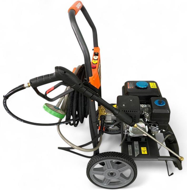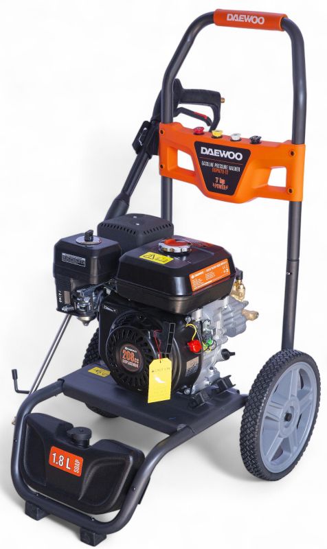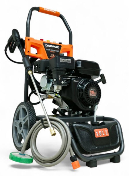 Der DAEWOO Hochdruckreiniger überzeugt mit starker Leistung und robuster Bauweise – ideal für anspruchsvolle Reinigungsarbeiten im privaten und gewerblichen Bereich. Ausgestattet mit einem leistungsstarken 4-Takt-Benzinmotor und einer Motorleistung von 7 PS, erzeugt das Gerät mit seinem hochwertigen Messingpumpenkopf einen beeindruckenden Arbeitsdruck von bis zu 207 bar bei einer Wasserfördermenge von 10 Litern pro Minute. Damit entfernen Sie mühelos hartnäckigen Schmutz von Fahrzeugen, Wegen, Fassaden oder Maschinen.