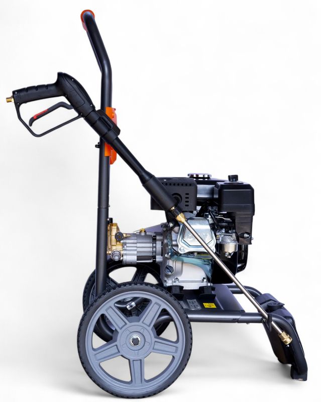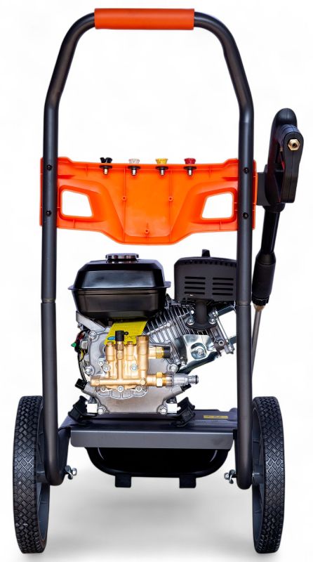 Der Hochdruckreiniger verfügt über eine Leerlaufdrehzahl von 3400 U/min und wird bequem über einen Reversierstarter in Betrieb genommen. Dank des großzügigen Kraftstofftanks mit 3,6 Litern und eines integrierten Seifentanks mit 1,8 Litern Fassungsvermögen sind auch längere Arbeitseinsätze ohne Unterbrechung möglich.