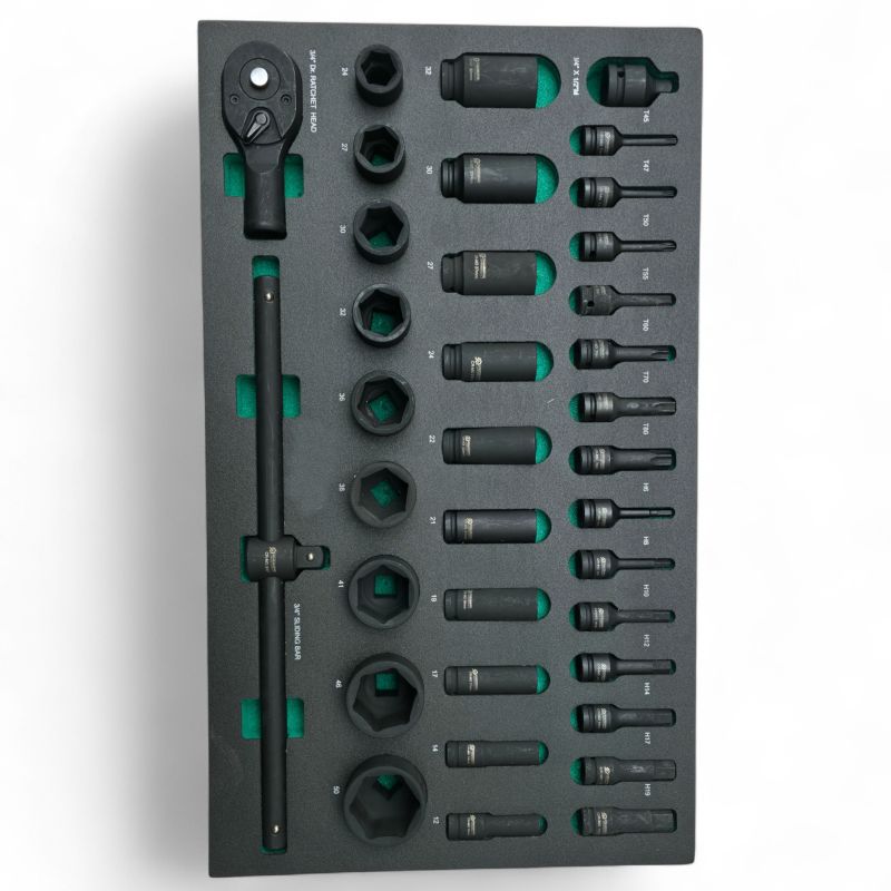 Einleger 9 – Ergänzungs-Schlagnuss- & Spezialnuss-Set ⅜″ Ratsche, Schlagnüsse 10–32 mm, Verlängerung, Kardangelenk sowie Langnüsse für Hex, Torx & Vielzahn – ideal für schwer zugängliche Stellen.