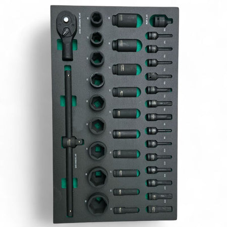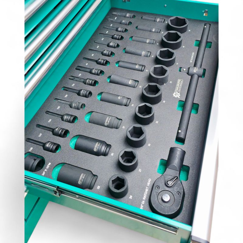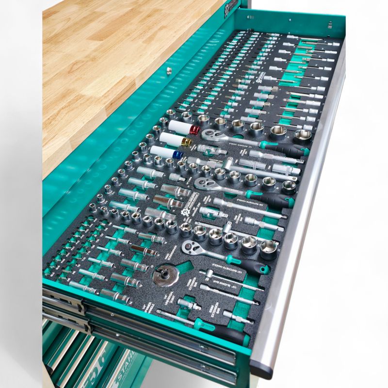 Einleger 8 – Ratschen, Verlängerungen & Schlagnüsse ¼″, ⅜″ & ½″ Ratschen, Verlängerungen bis 250 mm, Kardangelenke, Schiebegriffe, Schlagnüsse 10–32 mm (kurz & lang), farbcodierte Zündkerzennüsse – perfekt für Kraft- und Montagearbeiten.