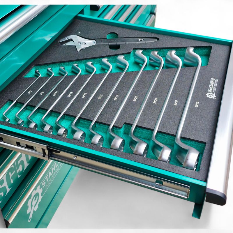 Einleger 11 – Doppelte Ringmaulschlüssel & Rollgabel Doppelschlüssel 6×7 mm bis 30×32 mm sowie verstellbarer Schraubenschlüssel 10″ – optimal für schnelle Schlüsselwechsel.